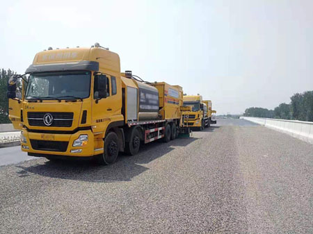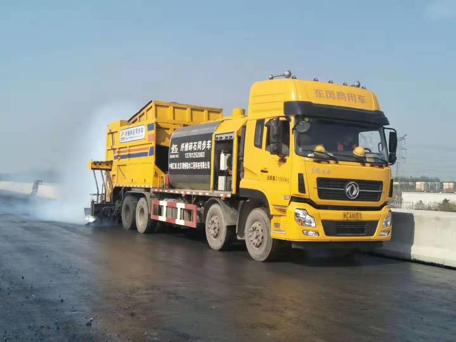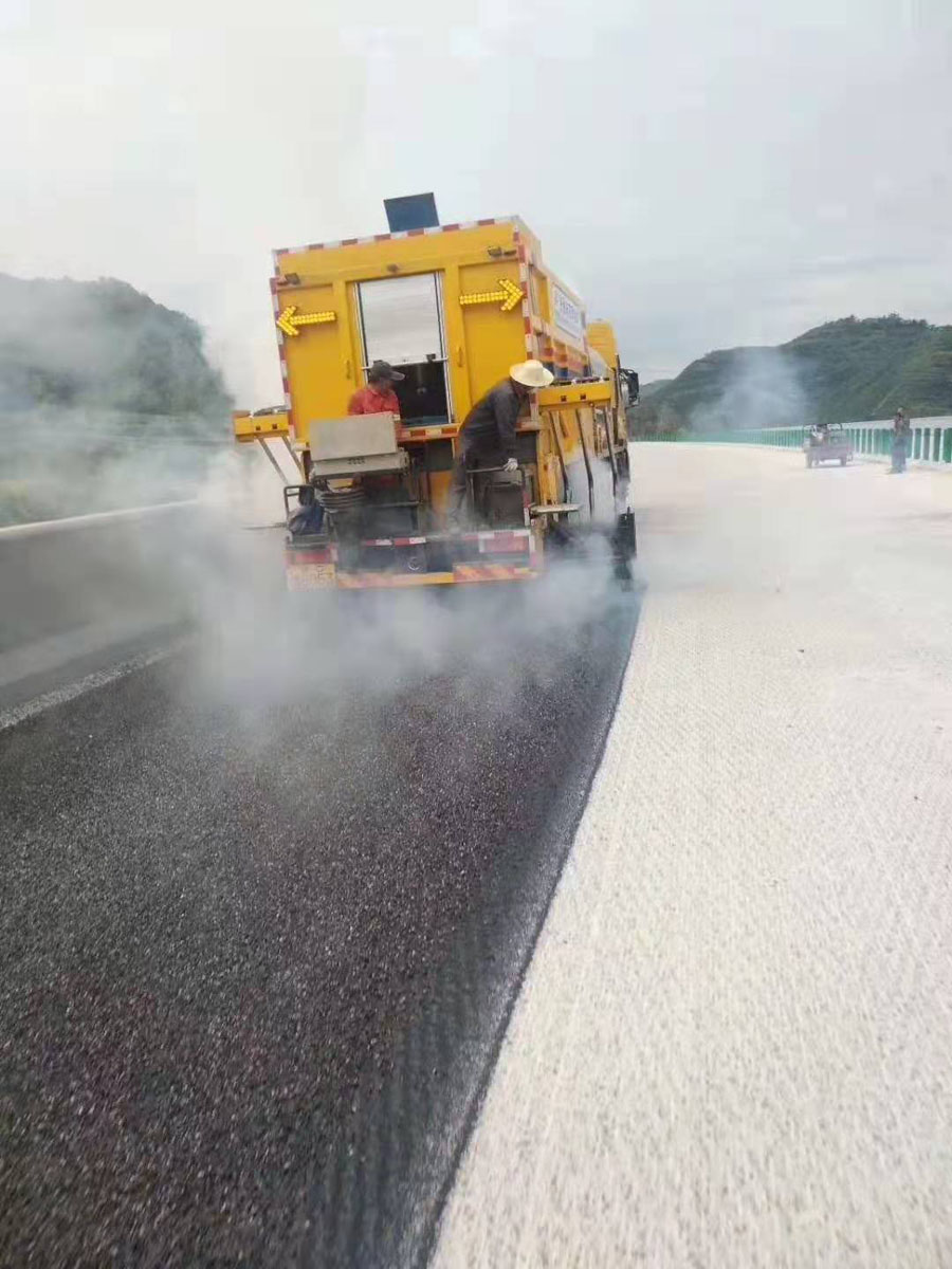 一、熱熔改性橡膠瀝青纖維碎石同步防水優(yōu)點與應用 1.該防水四同步作業(yè)施工,減少了傳統(tǒng)工藝乳化瀝青的破乳時間,大大的縮短了施工時間。該工藝特別適合于因交通量大而不能夠長時間封閉的道路。 2.由于是同步作業(yè),集料能夠迅速嵌入纖維與改性橡膠瀝青形成的網(wǎng)狀結構中,成型后集料被結合料網(wǎng)狀結構緊緊裹縛,形成一個復合的力學嵌鎖體系,纖維、瀝青和骨料緊密相連,有效地先治療骨料的滑移,脫落,使其具有高耐磨性。 3.纖維和改性橡膠瀝青優(yōu)良的抗拉能力、彈性恢復能力及耐高溫能力使其具有高穩(wěn)定性能。 4.良好的抗裂性能、抗變形能力,較高的粘結性能,快速同步施工減少的層間污染等優(yōu)點使其具有高粘結防水性能。良好的應力吸收和擴散能力,能夠有效地抑制基面反射裂縫和低溫收縮裂縫的發(fā)生。 5.該防水應用于橋面水泥混凝土和瀝青混凝土之間的防水粘結層。舊水泥路面或舊瀝青路面上加鋪瀝青路面時,作為層間粘層應力吸收層,防止反射裂縫。 6.作為瀝青路面、裂縫路面的養(yǎng)護。 7.新建公路時,作為油面和基層之間的防水粘結層。 8.作為機場跑道的防水下封層。